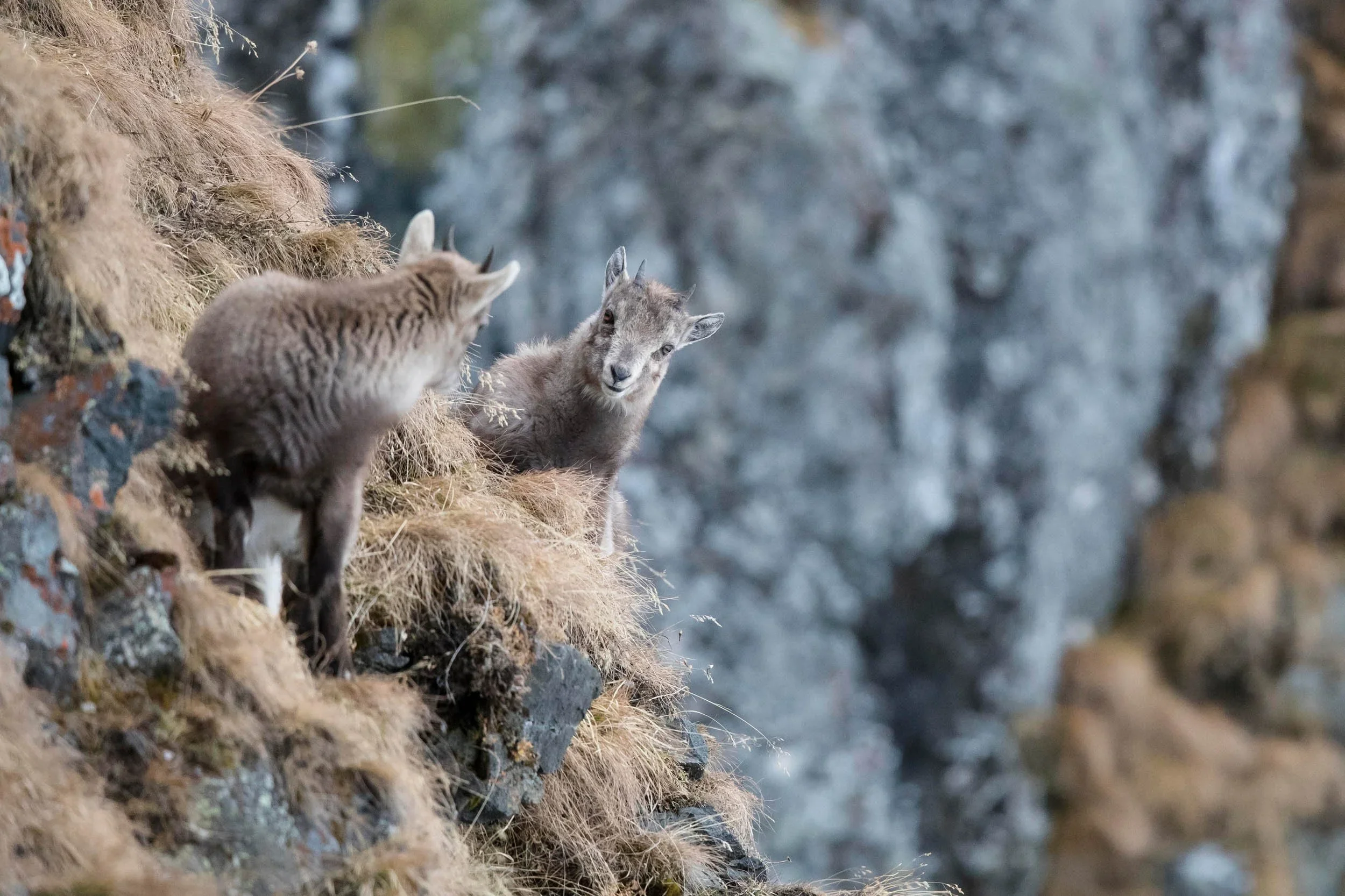 After a gestation period of roughly five months, females isolate themselves on steep, protected ledges to give birth. Single kids are most common, which limits population growth and makes recovery from population declines slow. However, they are capable of having up to three at once.